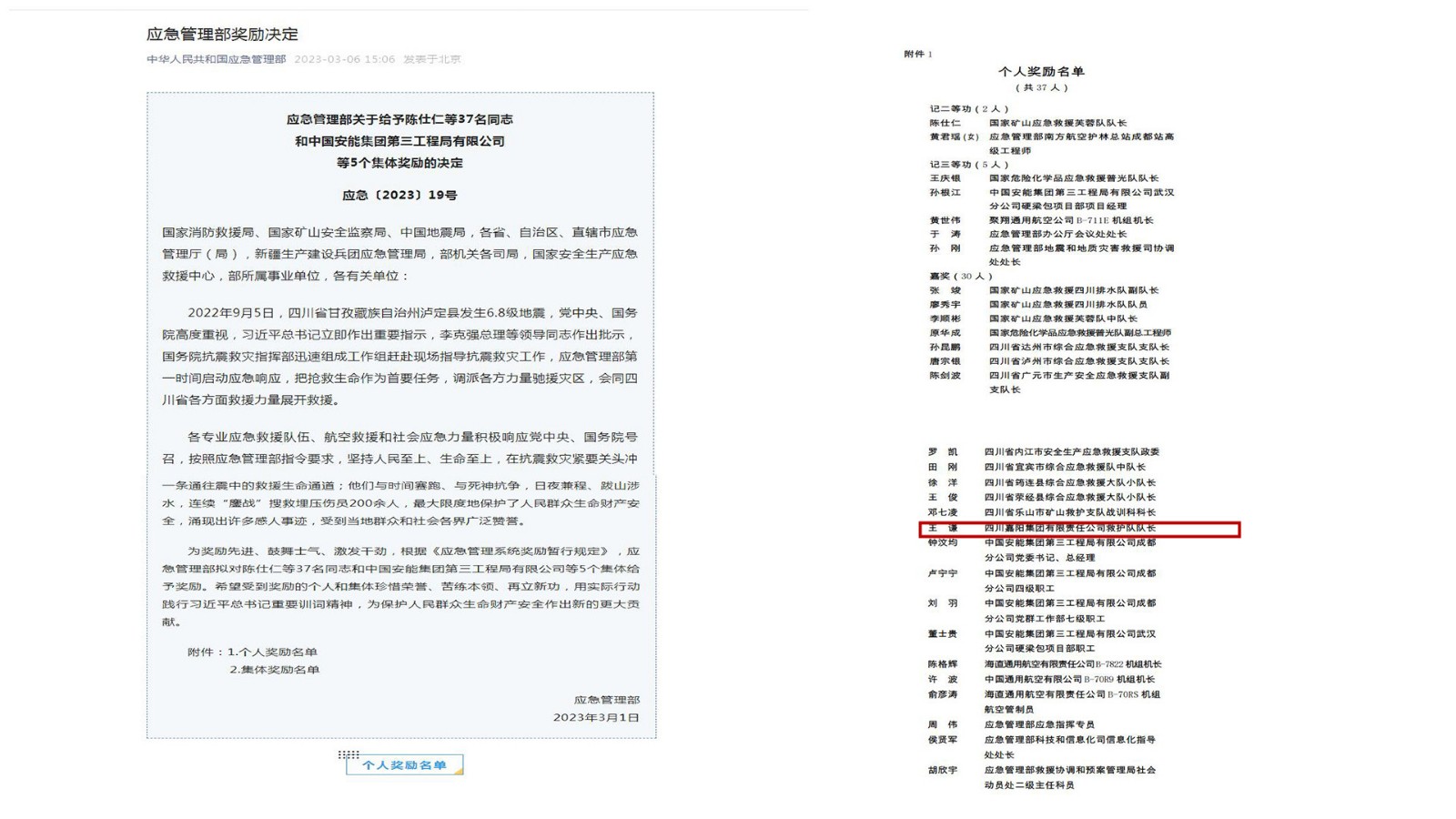 近日,应急管理部[2023]19号文件下发,对泸定抗震救灾表现突出的个人和集体进行奖励,华体网页版登录入口,华体(中国)矿山救护队队长王谦榜上有名。
