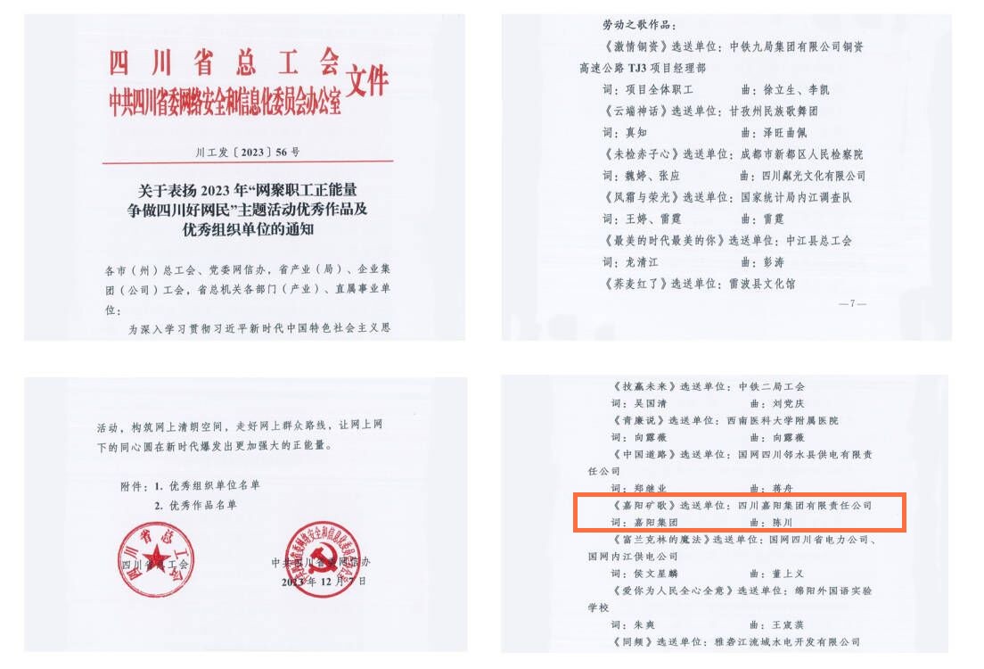 近日,四川省总工会下发《关于表扬2023年“网聚职工正能量争做四川好网民”主题活动优秀作品及优秀组织单位的通知》,由华体网页版登录入口,华体(中国)报送的视频《嘉阳矿歌》获劳动之歌作品奖。