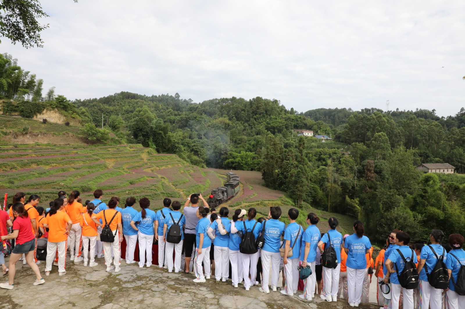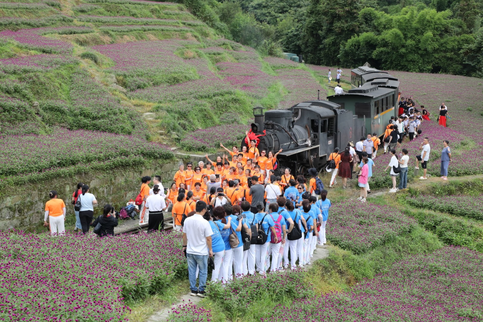 时下的芭石铁路段家湾,千日红花开正艳,漫山遍野的紫色精灵跳跃在山野间,层次分明,错落有致,与冒着蒸汽、吐着白烟的小火车相映成趣。这列承载着历史记忆的蒸汽小火车在缭绕的白烟中,缓缓驶过花海,让人仿佛穿越时空回到了那个纯真而质朴的年代。活动现场即兴的文艺表演,“小火车唤我去嘉阳”的歌曲对唱与“大海航行靠舵手”的舞蹈表演为静谧的山野平添了一份生动与活力。让游客在赏花之余,感受到更多的欢乐与温馨。