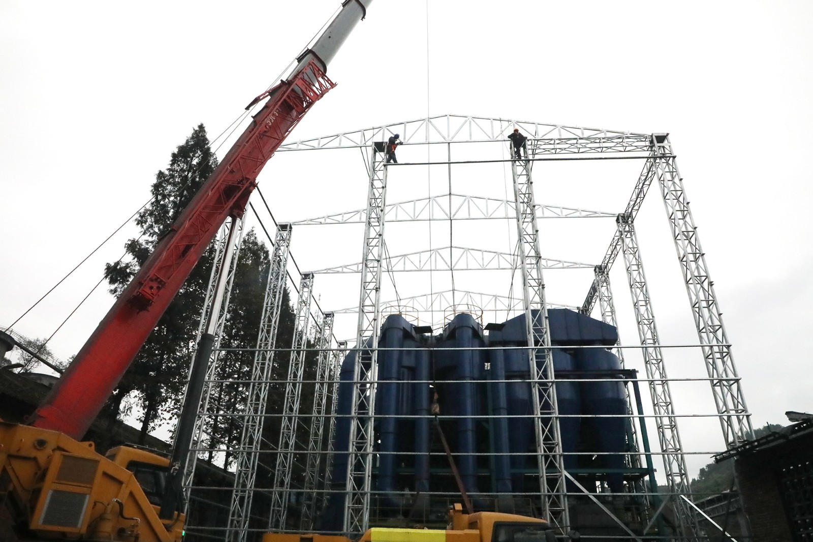 厂房主体采用坚固耐用的钢架结构,辅以高强度的热镀锌钢、短型钢、C型钢等材料,通过精密的焊接和螺栓连接,16组高耸的钢结构立柱在风选系统外围构筑了一个坚实的支撑“骨架”。按照设计,施工人员将使用岩棉夹芯板对整个“骨架”进行全覆盖,形成一个既能承载重负又具备优异抗风压性能的钢架结构厂房,可抵御恶劣天气的影响,最大限度地吸收和阻断因煤炭分选而产生的声音波和微粒物质。在施工过程中,所有操作均需高空作业。为此,承包商与公司专业技术人员密切合作,对每一环节严格监控,确保施工安全有序地推进。此次主厂房建设,不仅是对风选设备外观的美化升级,更是企业促进工业文明和生态文明和谐共存的具体体现。