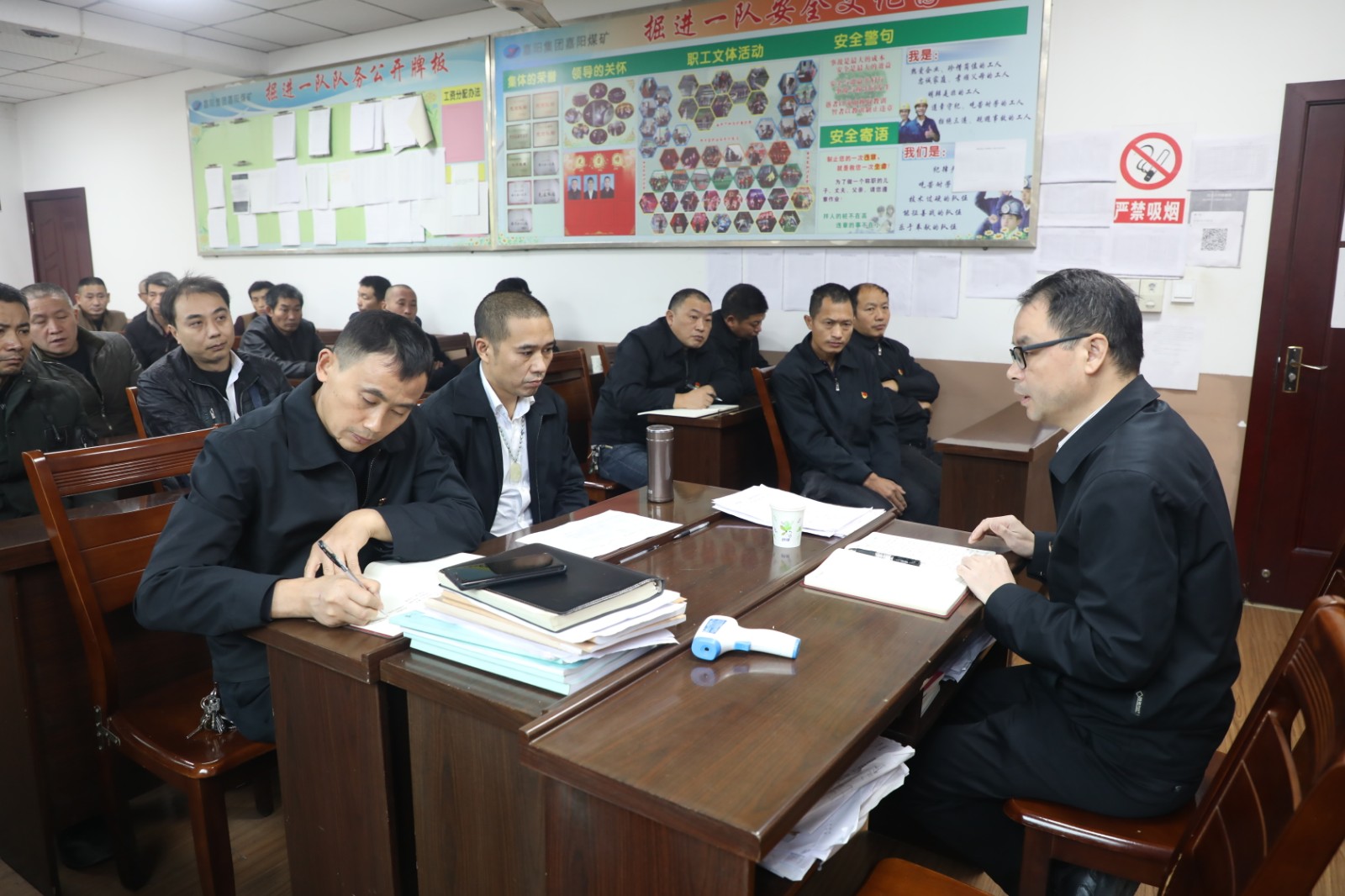 11月4日上午,纪委书记吕明强到所联系队站掘一队,为党员职工进行主题党课宣讲。他以《弘扬建党精神 牢记责任担当》为题,结合企业实际,深刻领会伟大建党精神的本质内涵和核心要义。他指出,弘扬伟大建党精神,践行初心使命就是要把学习成果转化为实际行动,将甘于奉献、吃苦耐劳的光荣传统和优良作风融入到工作中;就是要在困难面前身先士卒、敢挑重担,百折不挠、勇往直前;就是要把责任和担当摆进工作中,严把安全关、严格遵守岗位操作规程,卯足干劲,在今年最后两个月的时间里全力搞好安全生产,完成好各项目标任务。