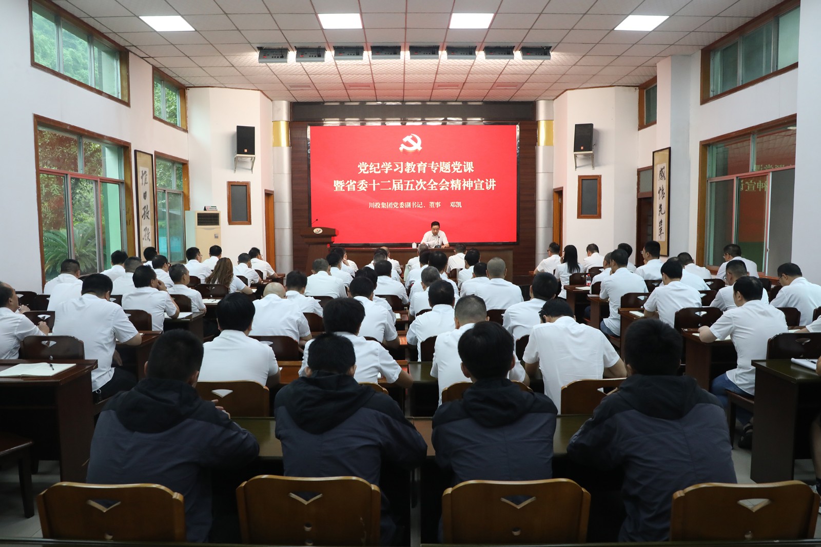 6月27日,川投集团党委副书记、董事邓凯到华体网页版登录入口,华体(中国)作党纪学习教育专题党课暨省委十二届五次全会精神宣讲,公司领导班子成员、中级管理人员、各级党支部书记及部分职工聆听宣讲。